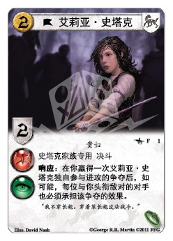 响应:在你赢得一次艾莉亚·史塔克独自参与进攻的争夺后,如可能,每位与你头衔敌对的对手也必须承担该争夺的效果。